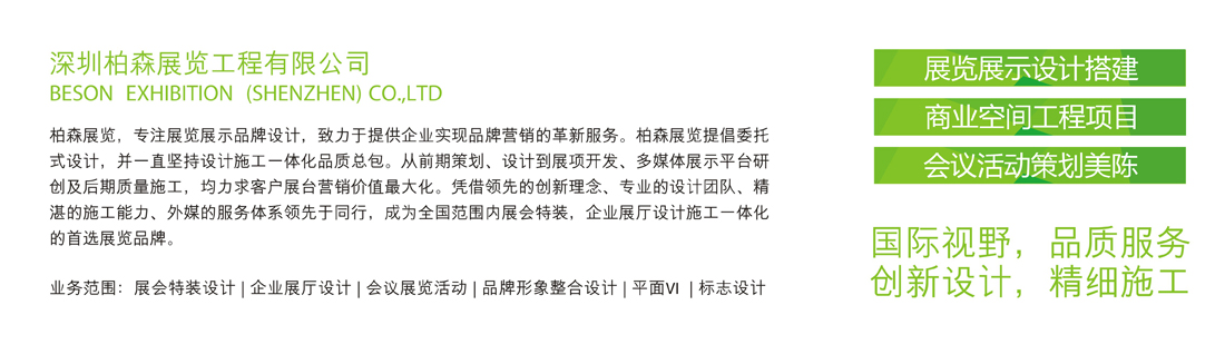 柏森展示:專注展覽展示品牌設(shè)計(jì),提供深圳展臺(tái)搭建,深圳展臺(tái)設(shè)計(jì),香港展臺(tái)搭建設(shè)計(jì),是優(yōu)質(zhì)的深圳展覽工程公司。致力于提供企業(yè)實(shí)現(xiàn)品牌營(yíng)銷的革新服務(wù)。柏森展示提倡委托式設(shè)計(jì),并一直堅(jiān)持展臺(tái)設(shè)計(jì)施工一體化品質(zhì)總包。從前期展覽策劃、設(shè)計(jì)到展項(xiàng)開發(fā)、多媒體展示平臺(tái)研創(chuàng)及后期質(zhì)量施工,均力求客戶展臺(tái)營(yíng)銷價(jià)值最大化。憑借領(lǐng)先的創(chuàng)新理念、專業(yè)的設(shè)計(jì)團(tuán)隊(duì)、精湛的施工能力、外媒的服務(wù)體系領(lǐng)先于同行,成為全國(guó)范圍內(nèi)展會(huì)特裝,企業(yè)展廳設(shè)計(jì)施工一體化的首選展覽品牌公司。